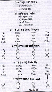 - Phần Vô hình gồm : Tam thập lục Thiên (36 từng Trời) và Tứ Đại Bộ Châu (4 Bộ Châu lớn) ở không không trên thượng từng không khí. (Xem chi tiết nơi phần sau)